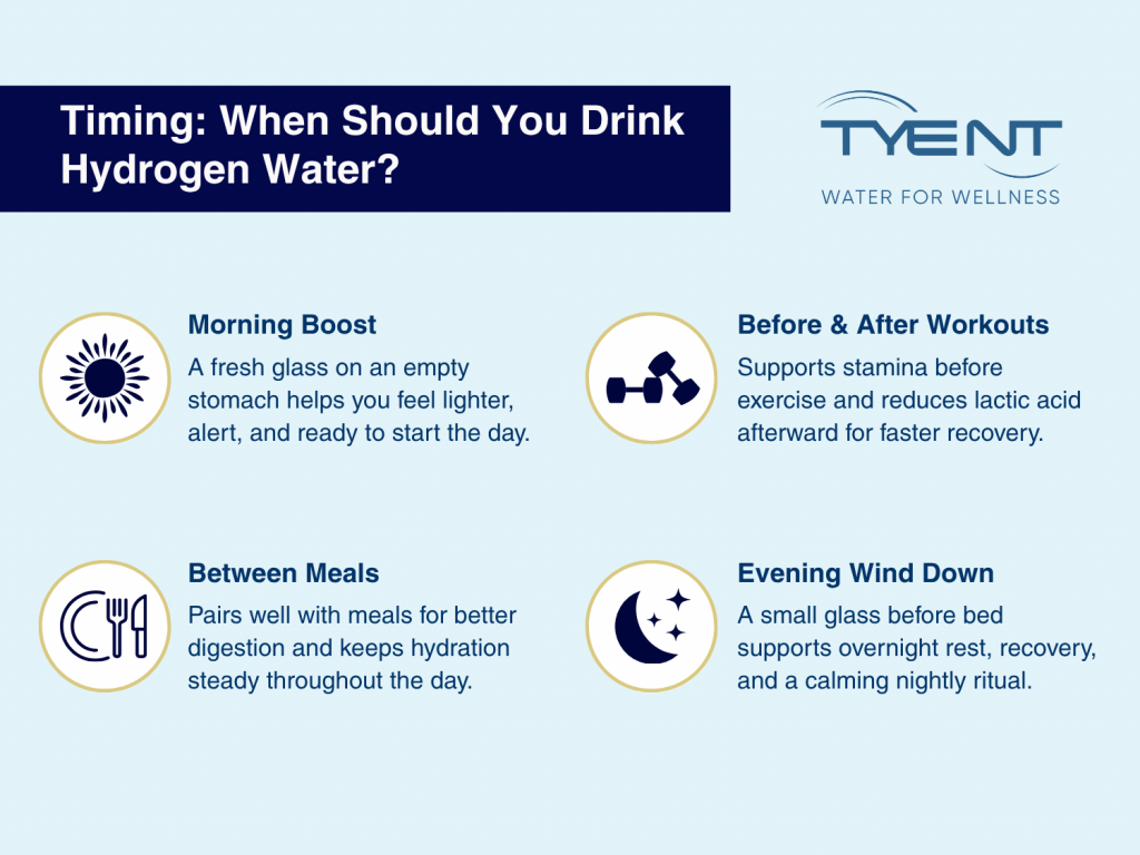 The timing of hydrogen water can influence how effectively your body absorbs and uses it. While the daily volume matters, spacing out intake across key moments of your routine helps sustain hydration and antioxidant support.