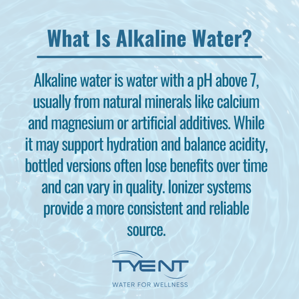 Alkaline water is any water with a pH above 7. It often comes from natural, mineral-rich sources, or it can be created by adding alkaline minerals like calcium, magnesium, or potassium.