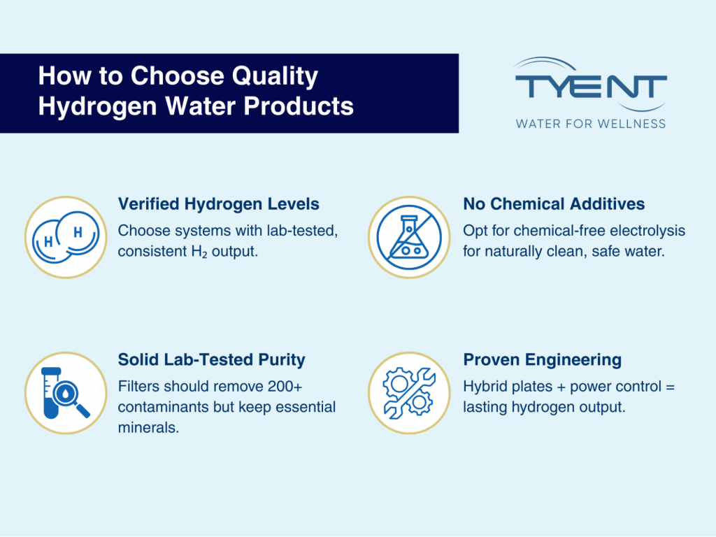 Look for a system that provides independent lab testing or clear specifications on dissolved hydrogen levels. The goal is a consistent and measurable concentration, rather than vague “enriched” claims. Tyent water ionizers are independently lab-tested and designed to consistently deliver high, verifiable levels of molecular hydrogen.