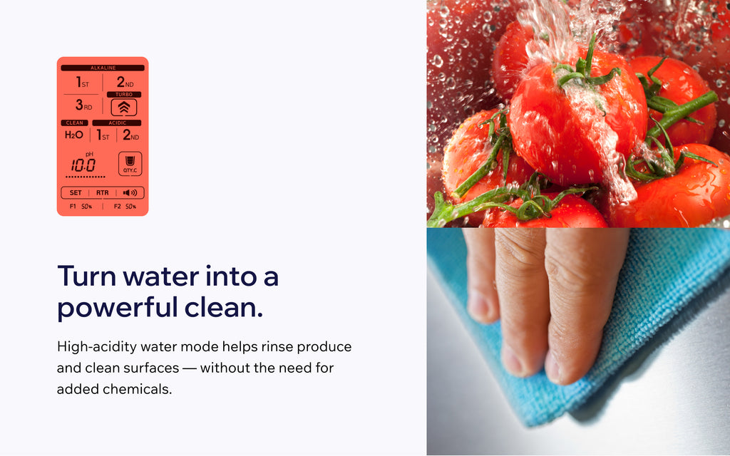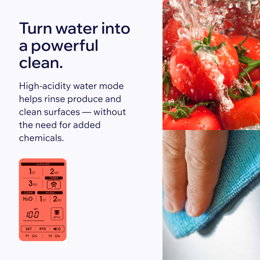Clean your home naturally without harmful chemicals or food safety concerns. The electrolytic technology of pure water without additives produces natural, cleansing, disinfecting water.
