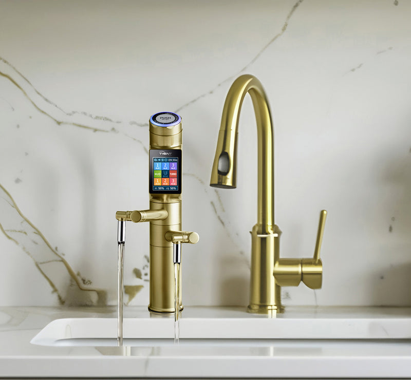 Built seamlessly into your kitchen, the UCE Gold Limited Edition is the ultimate built-in water ionizer. Delivering a broad pH range of 1.7–12.5, it provides hydrogen‑rich alkaline water for drinking and cooking, as well as powerful acidic water for natural cleaning. A sleek gold‑finished faucet with a vivid touchscreen keeps the design elegant and modern, while dual .01‑micron Dialipure™ filters remove over 200 contaminants to ensure every glass is as pure as it is refreshing.